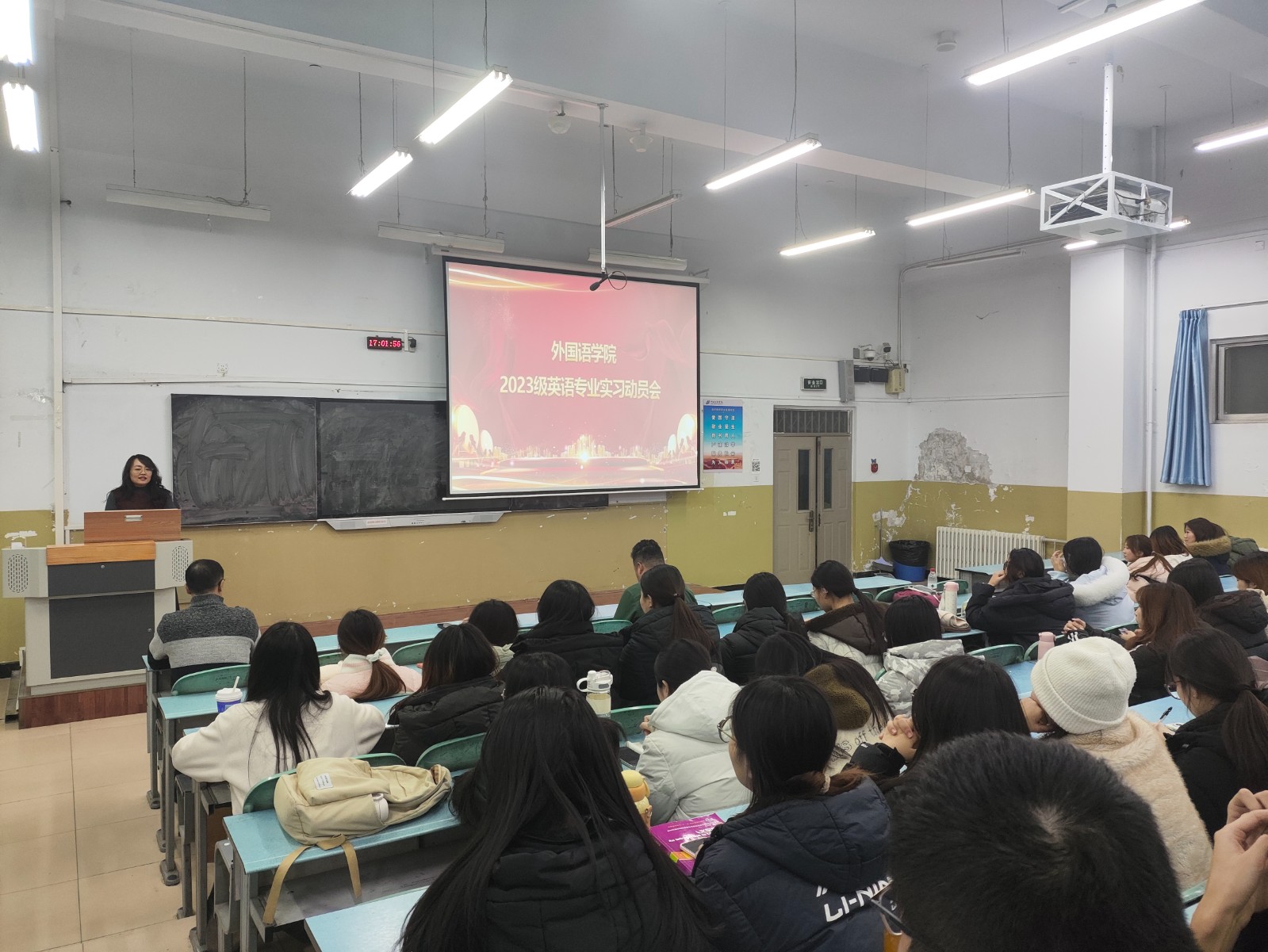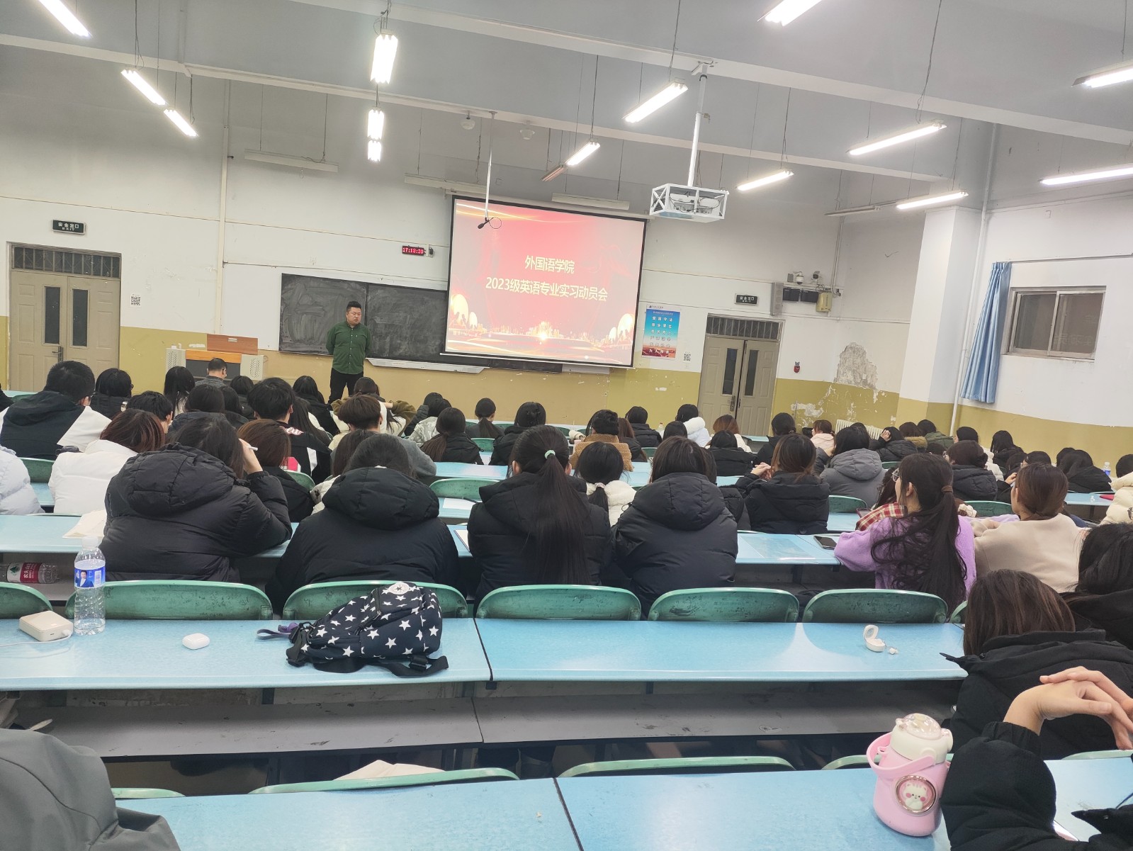 外国语学院12月25日在东校区第二阶梯教室召开2023级英语专业教育实习动员大会,学院党委副书记李人杰、副院长刘立莉、英语系主任梁昌明及辅导员渠少波出席,会议由梁昌明主持。